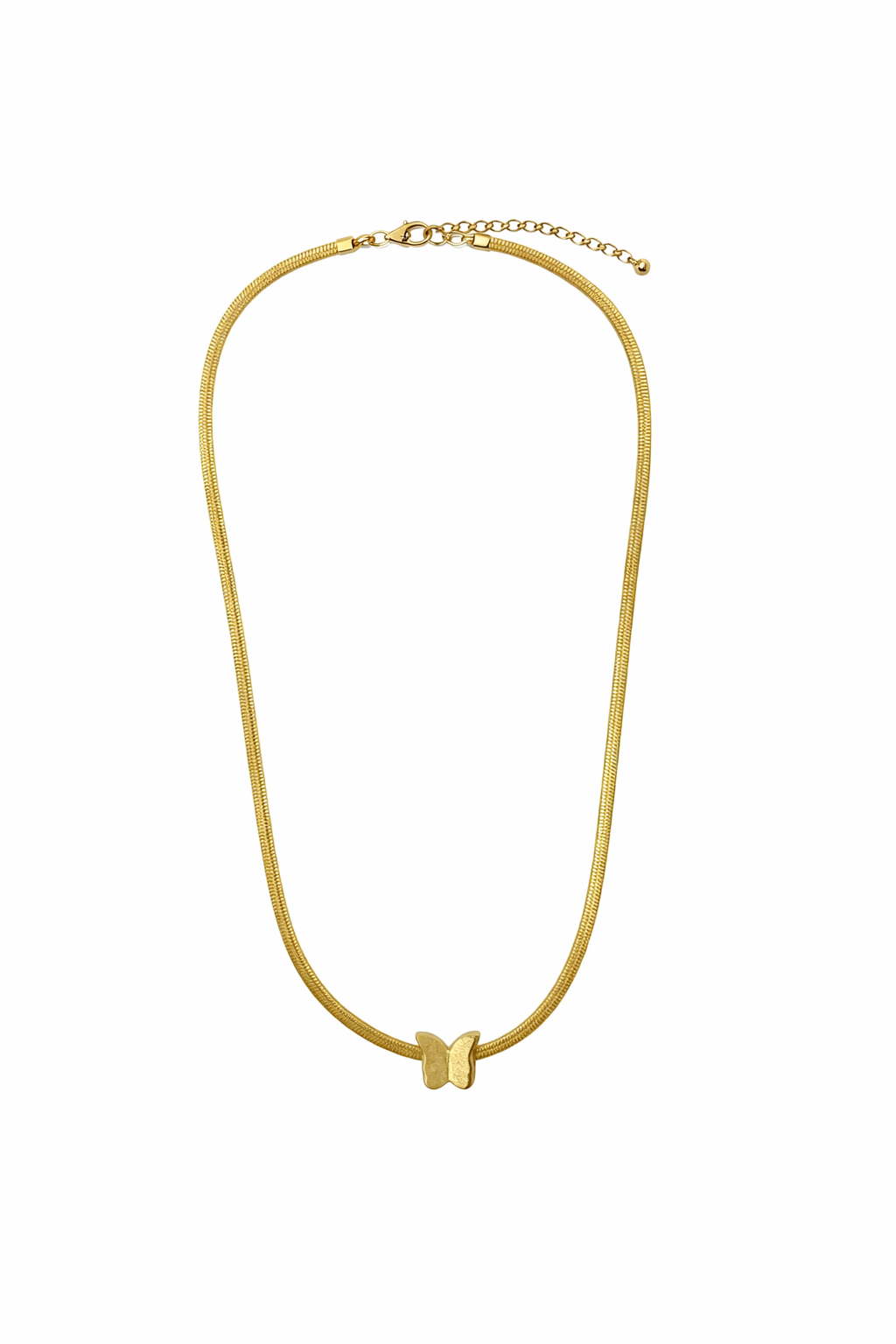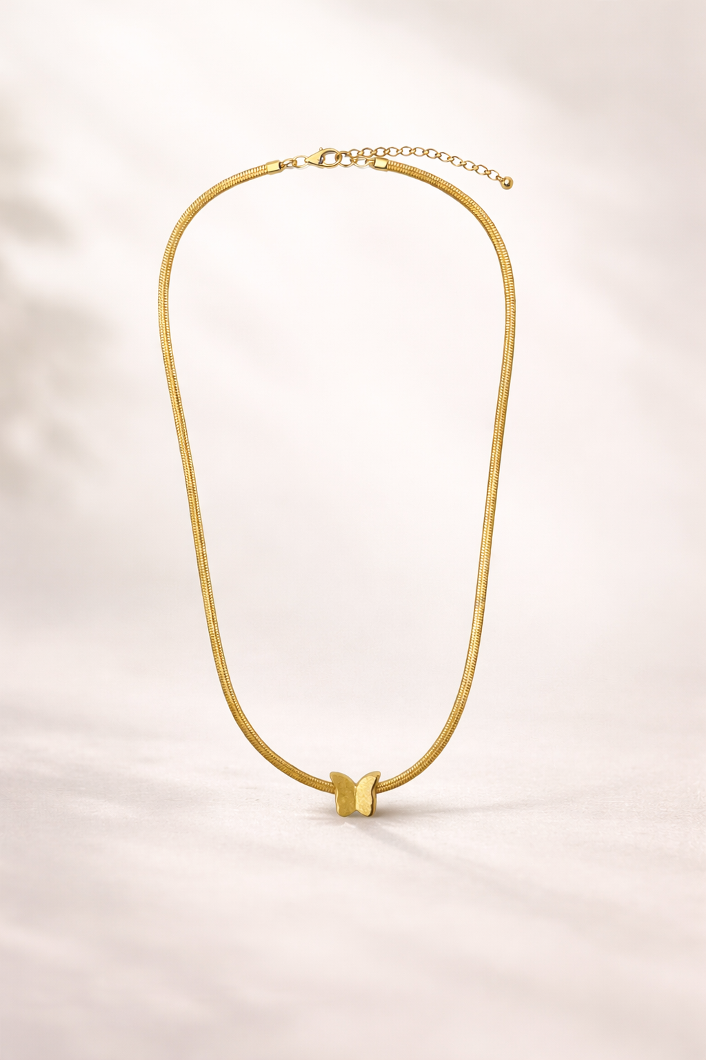 Center mein minimal butterfly pendant hai jo freedom, beauty aur femininity ko represent karta hai. High-quality gold plating isay long-lasting shine deti hai, jab ke adjustable chain har neck size ke liye perfect fit ensure karti hai.