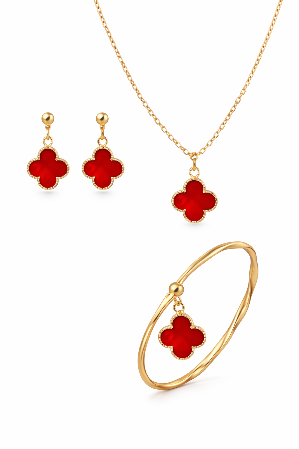 Elegant Red Clover Gold Plated Jewelry Set – Necklace, Earrings & Bracelet
