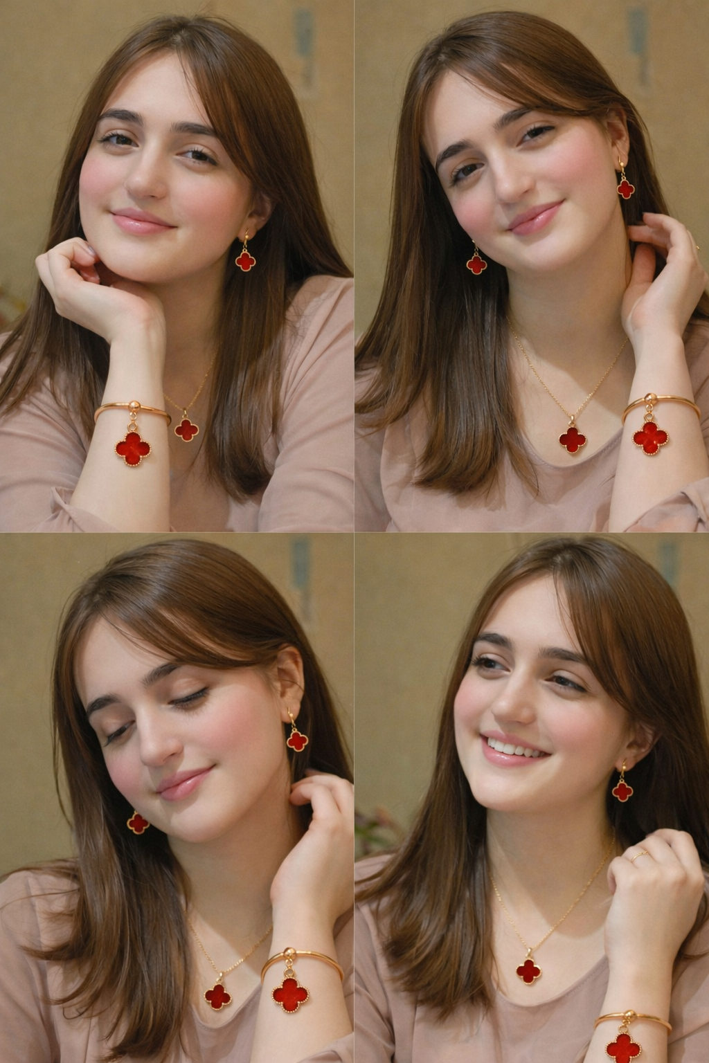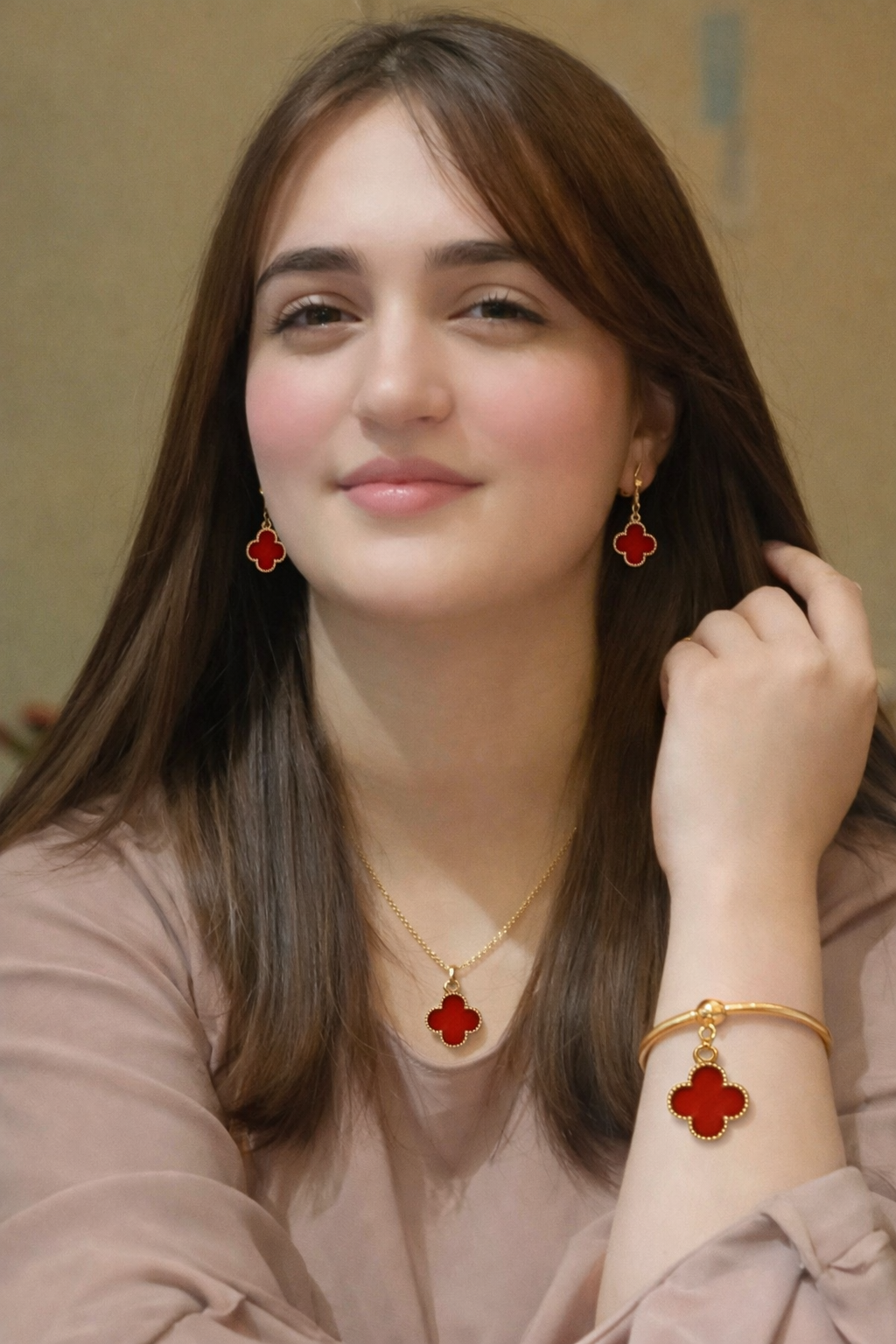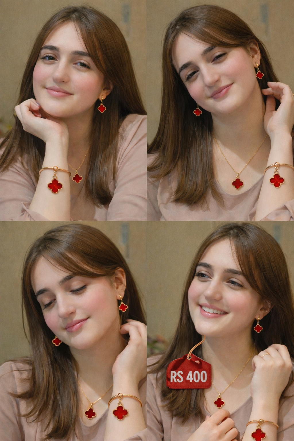 Luxury red clover jewelry set with necklace, earrings aur bracelet. Elegant gold-plated finish — perfect for parties & gifting.