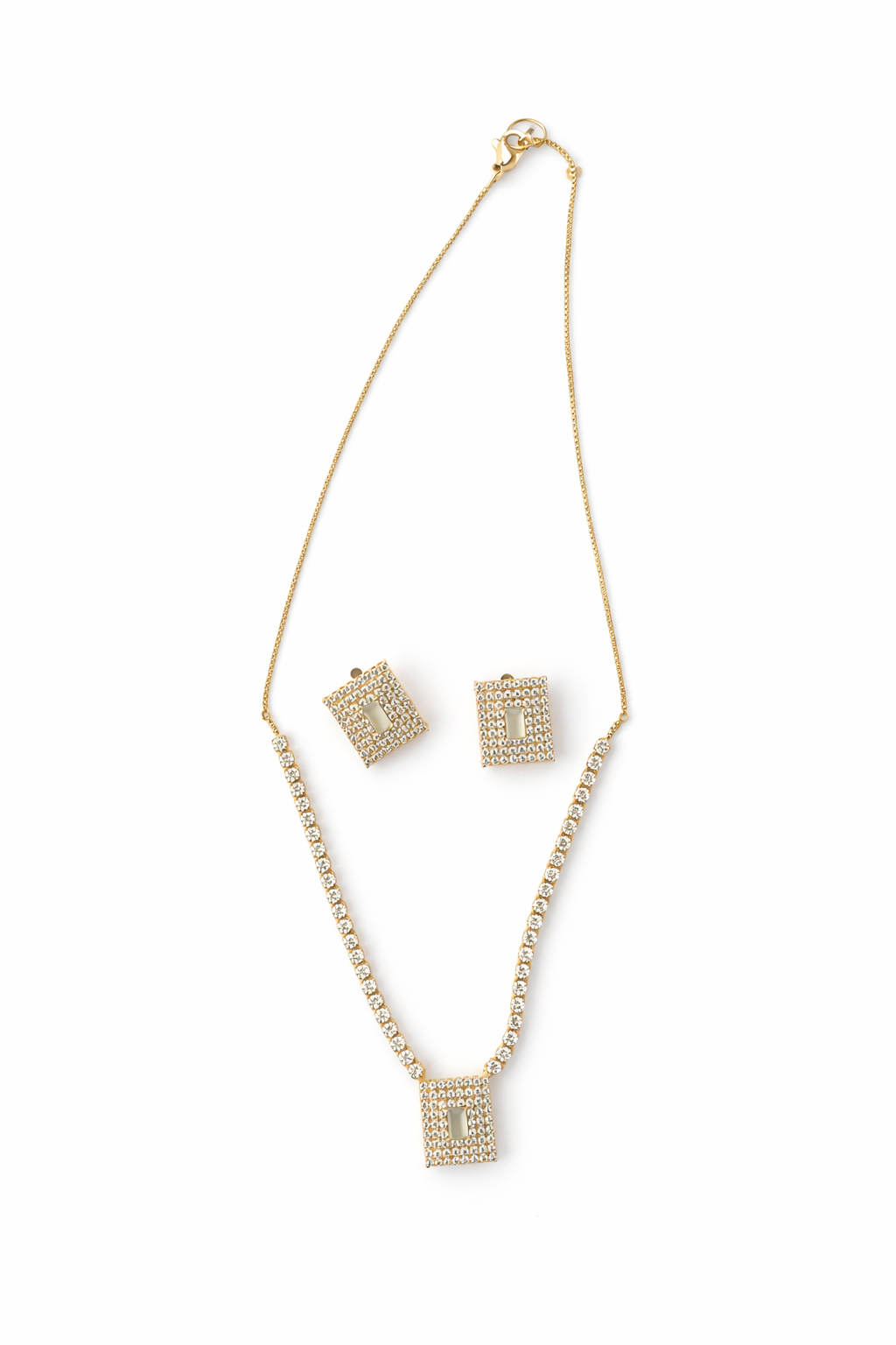 Necklace ke sath matching square stud earrings bhi shamil hain jo overall look ko complete karti hain. Gold-plated finish aur high-shine crystal stones is jewelry ko party-ready aur glamorous banate hain.