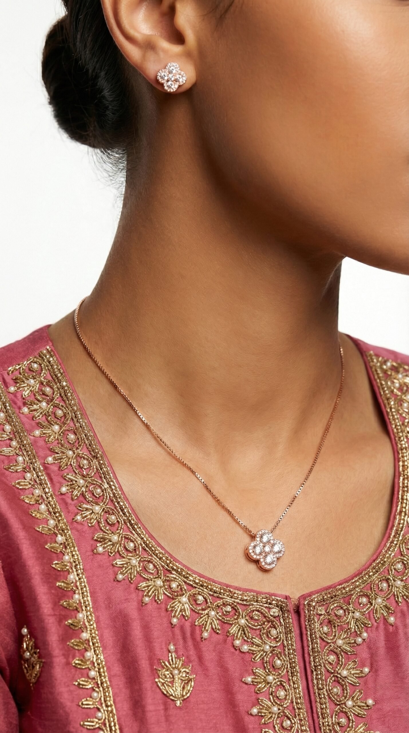 The pendant sits gracefully on a slim, elegant chain, while the matching flower stud earrings complete the coordinated look. Whether worn at weddings, parties, formal events, or as everyday luxury, this set enhances your overall appearance effortlessly.